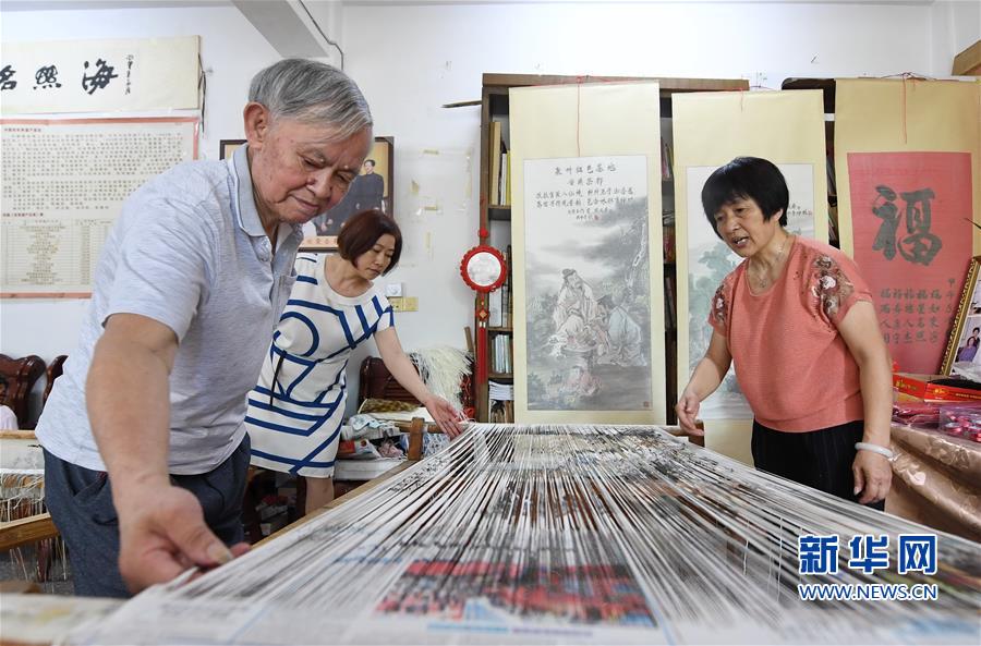 6月4日,周文虎在查看女工编织的纸织画。新华社记者 林善传 摄
